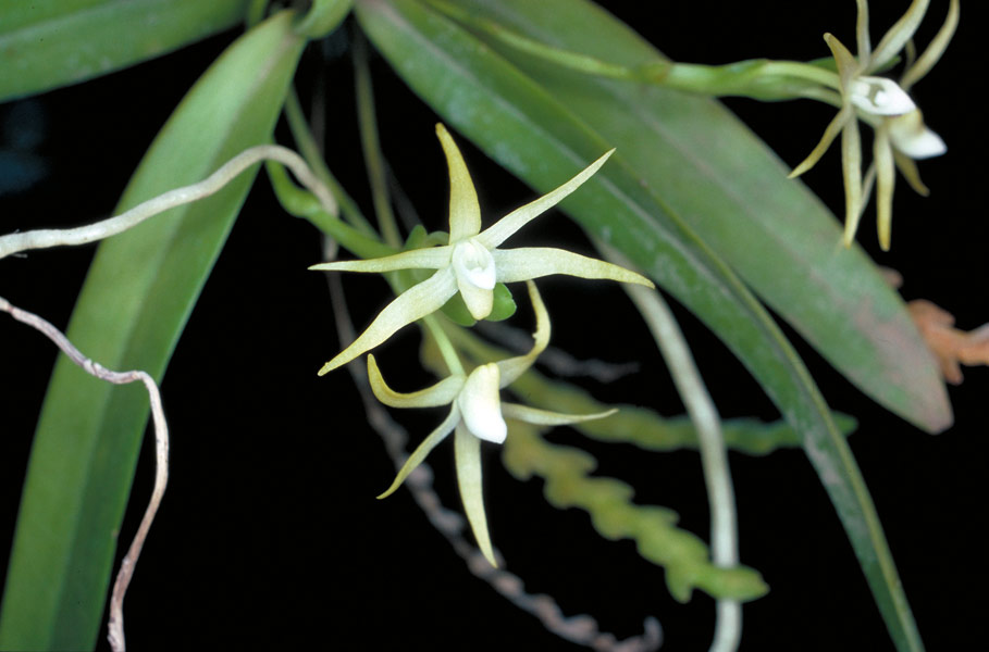 A monopodial epiphyte found in Papua and New Guinea in lowland forests at elevations around 60 to 500 meters as a miniature sized, hot growing epiphyte suspended from mossy tree branches in dense rainforests with short, slightly flattened, unbranched stems enveloped completely by leaf-bearing sheaths and carrying erect-patent to patent, oblong to oblong-ligulate, obtuse, minutely and unequally bilobulate, slightly contracted basally, glabrous, somewhat coriaceous leaves that blooms in the summer on an axillary, 4 1/4 to 5 3/4" [11 to 14 cm] long, many [20] flowered inflorescence with 1 to 2 at a time, successively many flowers produced on a congested, extending rachis over several months with large, distichous, rather lax, bilaterally flattened, ovate, subacute floral bracts that are shorter than the ovary and carrying ephemeral, fleshy, wide opening flowers.