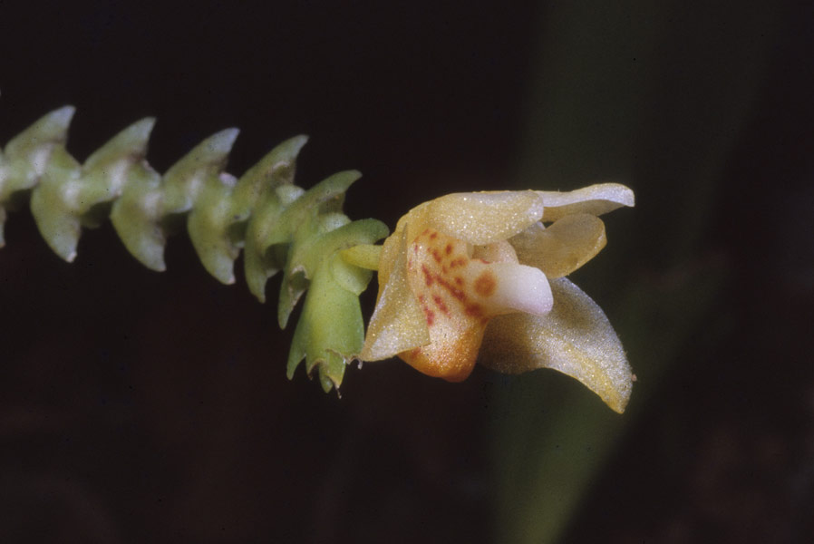 Found in Java and Sumatra at elevations around 1220 to 1525 meters as a medium sized, cool growing epiphyte with an elongate stem carrying narrowly oblong, obtuse, somewhat narrowing towards the apex, shortly bilobed apically, lobes obtuse, with a short mucro between, fleshy leaves that blooms in the late summer and early fall on a often two from an internode, peduncle 3.4 to 6" [8.5 to 15 cm] long, 4 tubular sheathed, rachis zig zag, to 8.8" [22 cm] long, bracted, to 15.2" [38 cm] long overall, successively single, few flowered inflorescence with triangular, flattened, keeled floral bracts and carrying fleshy flowers.