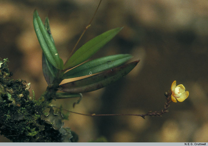 Found in New Guinea, Solomon Islands, Fiji, Vanuatu and Samoa in montane forests at elevations of 1000 to 2000 meters as a miniature sized, cool growing epiphyte with a short, densely leafy stem carrying 3 to 5, ligulate, obliquely subacute, Somewhat fleshy leaves that blooms in the summer and fall on a very slender, 4 to 5.2" [10 t o13 cm] long, rather stiff inflorecence with saw-like bracts and conduplicate, falcate-ovate, shorter than the ovary floral bracts.