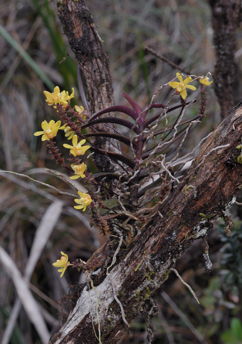 Found in Sabah Borneo in lower to upper montane ridge forests at elevations around 1800 meters as a mini-miniature sized, cool growing twig epiphyte with a stem enveloped entirely by imbricating leaf sheaths and carrying narrowly ligulate, obtuse to subacute, thick, succulent, blotched purple above, uniform purple beneath leaves that blooms in the fall on a porrect, 1.2 to 2.4" [3 to 6 cm] long overall, wiry, purple, rachis .4 to .8" [1 to 2 cm] long, swollen, purple, successively single flowered inflorescence with sheathing bracts enveloping the peduncle and with triangular-ovate, obtuse floral bracts.