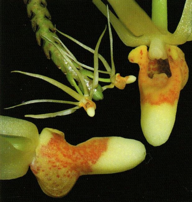 Found in penninsular Malaysia and Sumatra in primary forests at elevations of 100 to 860 meters a small sized, hot to warm growing epiphyte in partially logged primary forests on thinly mossy small branches of small to medium sized river side trees with a spreading stem enveloped by compresssed, green, often stained maroon sheaths and carrying spreading to descending, ligulate, leathery, green, sometimes red to maroon marked in youth, obtuse, unequally bilobed leaves that blooms in the spring and fall from the rhizome between the pseudobulbs, to 6" [15 cm] long, elongating, successively several flowered inflorescence with persistent, deflexed with age, overlapping bracts and carrying close set flowers