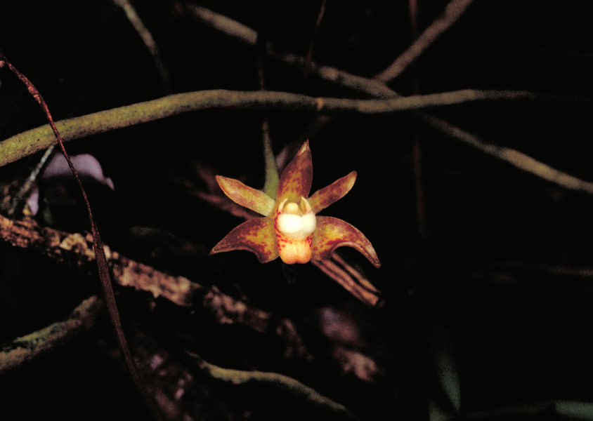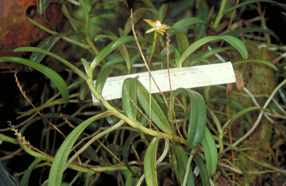 Found in penninsular Malaysia at elevations around 1300 to 1400 meters as a miniature to small sized, cool growing epiphyte with a stout stem carrying linear to oblong, rounded apically, narrowing below into the basally clasping leaves that blooms on 1.6 to 2.4" [4 to 6 cm] long, rachis to .6" [1.5 cm] long, successively single, several [7] flowered inflorescence with non-overlapping bracts..