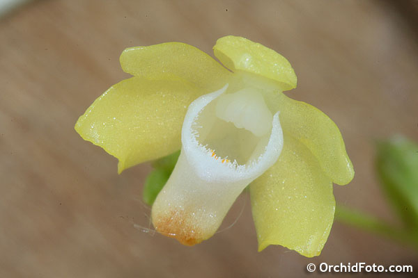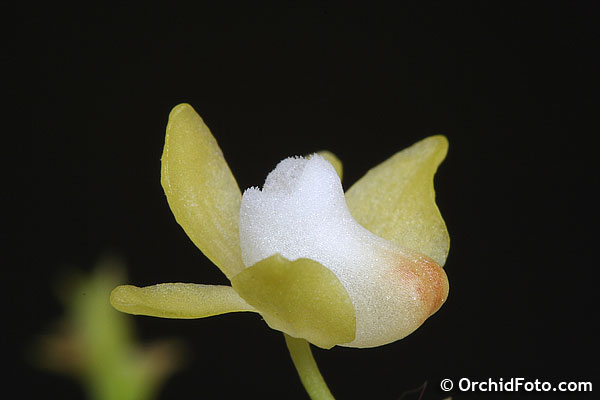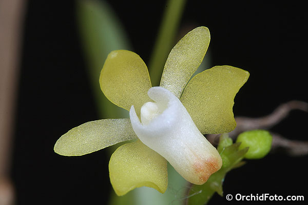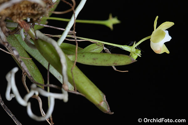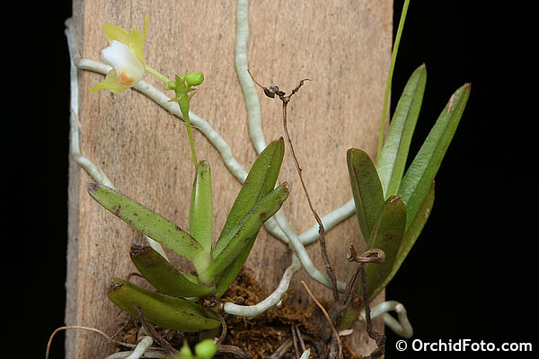 Found in Assam, Bhutan and the eastern Himalayas in forests at elevations around 500 meters as a mini-miniature sized, hot to warm growing epiphyte with 3 to7, subterete, distichous, equitant, jointed at the base, channeled on the upper surface, acute apically leaves that blooms in the late spring and summeron 2 to 4, erect, .72 to 5" [1.8 to 12.5 cm] long, usually longer than the leaves, axillary, arising from the lower nodes, raachis strict, slender, cylindric, swollen apically, condensed at the apex, successively several flowered inflorescence.