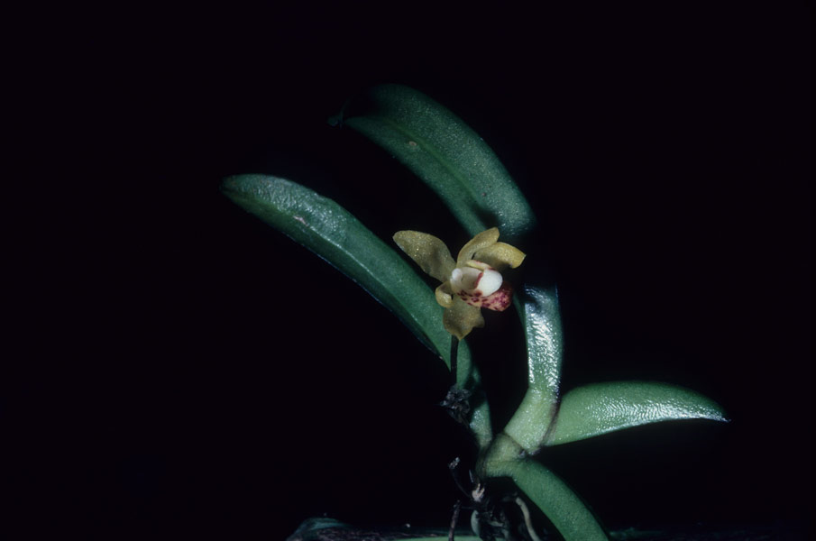 Found in Java, Sumatra, Bali at elevations around 700 to 1650 meters as a mini-miniature to miniature sized, warm to cool growing epiphyte with an erect stem carrying 8 or more, narrowly oblong, obtusely bilobed apically, v-shaped, basally clasping leaves that blooms in the spring on a thin, peduncle 3.6" [9cm] long, rachis elongating to 8" [20 cm] long, successively 1 to 2, several flowered inflorescence with separated floral bracts.