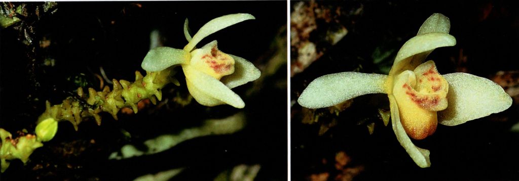 Found in Sabah Borneo in lowland forests climbing up mossy trunks of shrubs and trees at elevations around 1890 meters as a miniature sized, cool growing epiphyte with climbing stems enveloped by compressed, green, sulcate, persistent, longer than the internodes sheaths and carrying distichous, strap-shaped to elliptic, tapering at both ends, green constricted before the acute, briefly mucronate leaves that blooms in the fall on a suberect, arising from the lower and midstem nodes of the stem, peduncle .32 to .56" [.8 to 1.4 cm] long, provided with 2 tubular, basal bracts and sometimes another midway, expanding gradually before rachis, rachis swollen, to .6" [1.5 cm] or more, green, successively 1, several flowered inflorescence with quaquaversal, crowded, basally clasping rachis, triangular, free part recurved, thick and fleshy, subacute to obtuse apex shorter than the ovary floral bracts and carrying ephemeral, wide spreading flowers.