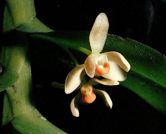 Found in Taiwan, Thailand, Java, Sumatra and Borneo in lowland forests on tree trunks at elevations of 500 to 600 meters as a medium to large sized, warm, pendent growing epiphyte with a pendulous, compressed, leafy throughout stem carrying elliptic, thick, slightly fleshy, conduplicate towards the base, acute leaves that blooms at most any time of the year on an axillary, .4 to .8" [1 to 2 cm] long, much shorter than the leaves, successively few, several flowered, inflorescence with persistent, not distichous, ovate-triangular floral bracts and carrying short lived flowers