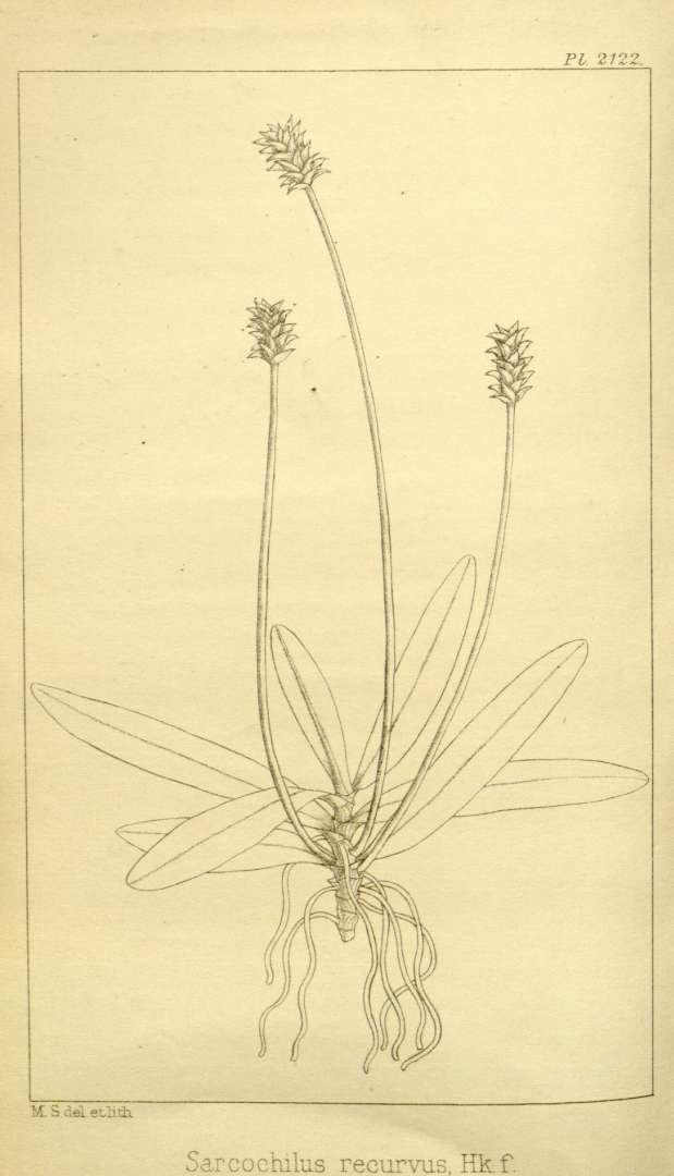 References W3 Tropicos, Kew Monocot list , IPNI ; Icones 22 Hooker 1892 as Sarcochilus recurvus drawing fide; The Orchids of Thailand Seidenfaden & Smitnand 1963 drawing of flower; Opera Botanica #95 Seidenfaden 1988 drawing fide; The Orchids of Penninsular Malaysia and Singapore Seidenfaden & Wood 1992 drawing flower & plant