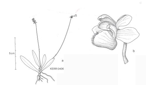 Found in Thailand and penninsular Malaysia on small trees near rivers at elevations around 1000 meters as a mini-miniature sized, warm to cool growing epiphyte with a short stem carrying a few linear, obtuse, basally clasping leaves that blooms on a 6" [15 cm] long, with the rachis consisting of an apical clump of broad, fleshy bracts giving rise to successively single, several flowered inflorescence carrying flowers with pale red brown spots and a hairy lip.