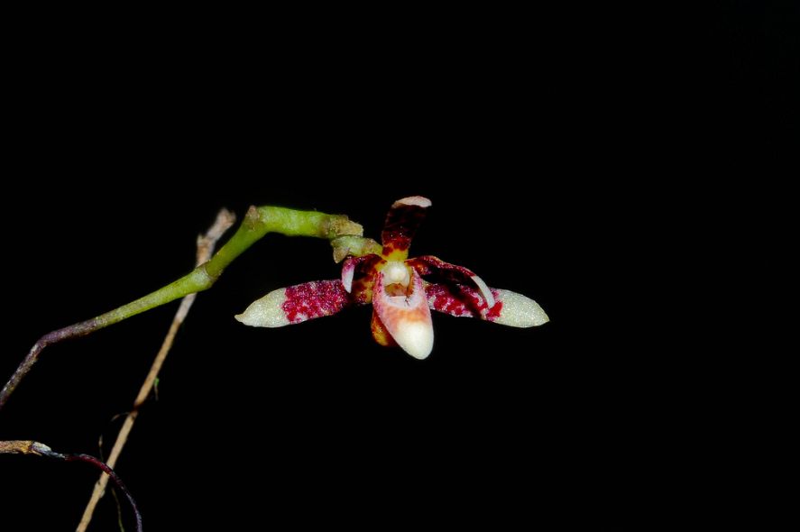 Found in Sabah Borneo in lower montane forests at elevations around 1500 meters as a miniature to small sized, cool growing epiphyte with a simple to branching stem carrying narrowly elliptic, thickly coriaceous, obtuse, dorsally shortly carinate-apiculate leaves that blooms in the late summer and early fall on an erect, peduncle 2.52" [6.3 cm] long, pale green flushed with purple, bracts adpressed tothe peduncle, rachis .4 to .6" [1 to 1.5 cm] long, pale green, 3.4" [8.5 cm] long overall, successively 1 to 2, several flowered inflorescence with ovate, acute floral bracts and carrying non-resupinate flowers