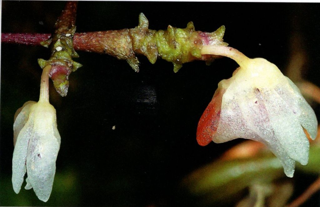 Found in Sabah Borneo in mossy low Dacrydium-Leptospermum forests at elevations around 1890 meters as a miniature sized, cool growing epiphyte with erect stems enveloped by compressed, greenish-brown, suffused and spotted with red maroon, persistent, longer than the internodes sheaths and carrying distichous, strap-shaped, thick, green pink-purple suffused and spotted with red maroon, unequally bilobed, acute leaves that blooms in the later fall on a few, suberect, arising from the lower nodes of the stem, peduncle 1.88 to 2.8" [4.7 to 7 cm] long, provided with 2 tubular, basal bracts and another midway, becoming warty and much expanded before rachis, purple, rachis swollen, to .4" [1 cm] or more, successively 1, several flowered inflorescence with quaquaversal, not crowded, basally clasping rachis, triangular, free part recurved, thick and fleshy, acute apex, slightly shorter than the ovary floral bracts and carrying ephemeral flowers.