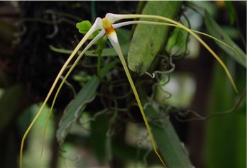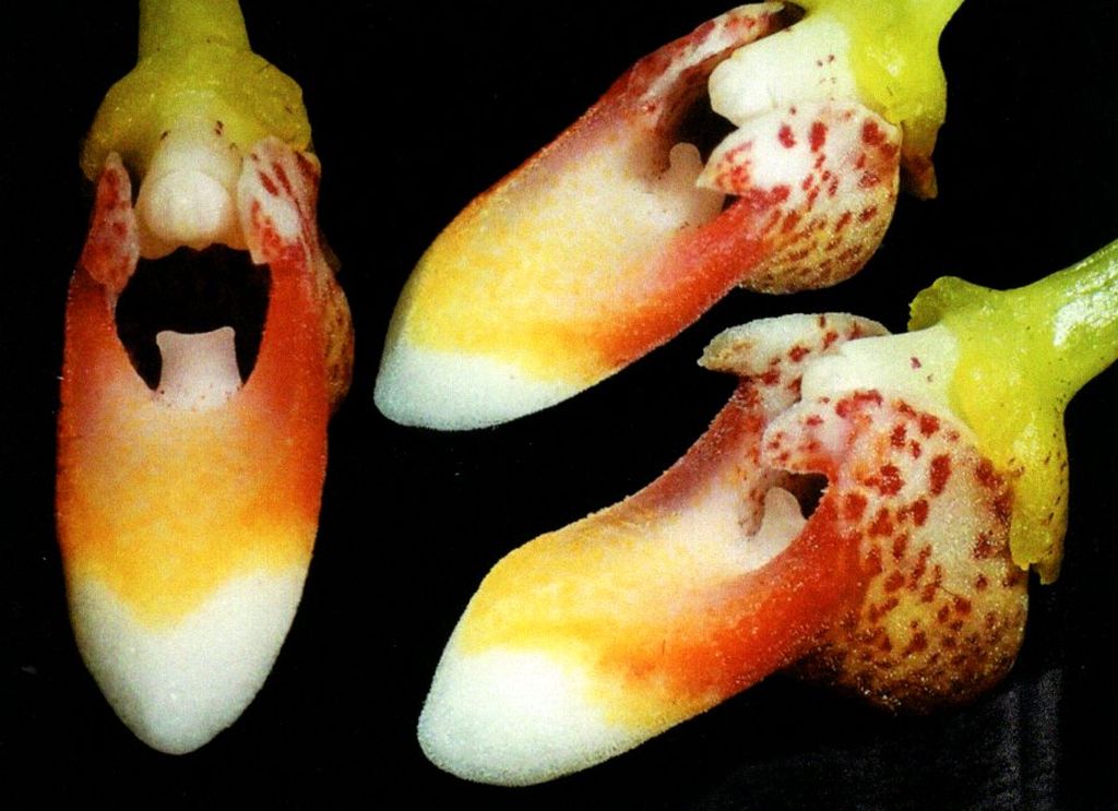 Found in Thailand, Malaysia and Borneo in swampy forests at elevations around sea level to 300 meters as a giant sized, hot growing epiphtye with a long, climbing, scrambling or hanging stem carrying fleshy, oblong or widest near the base, bilobed and rounded apically leaves that blooms in the summer on a very variable, 2 to 8" [5 to 20 cm] long overall, peduncle .4 to 1.6" [1 to 4 cm] long, rachis to 1.2" [3 cm] long, widening and bracteate, successively single flowered inflorescence.