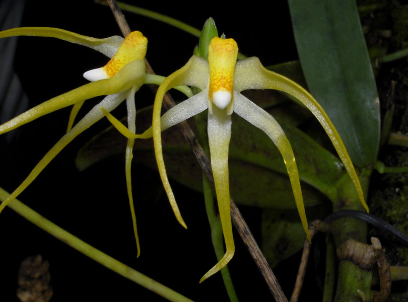 Found in Bangladesh, Myanmar and Malaysia at elevations around 500 to 950 meters as a small sized, warm growing epiphtye with a stout stem carrying fleshy, oblong, bilobed apically leaves that blooms on a spreading, becoming bracteate and wider at the rachis, 8" [20 cm] long, successively single to 2, many flowered inflorescence