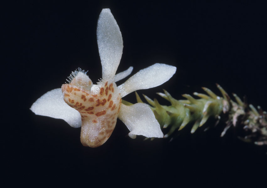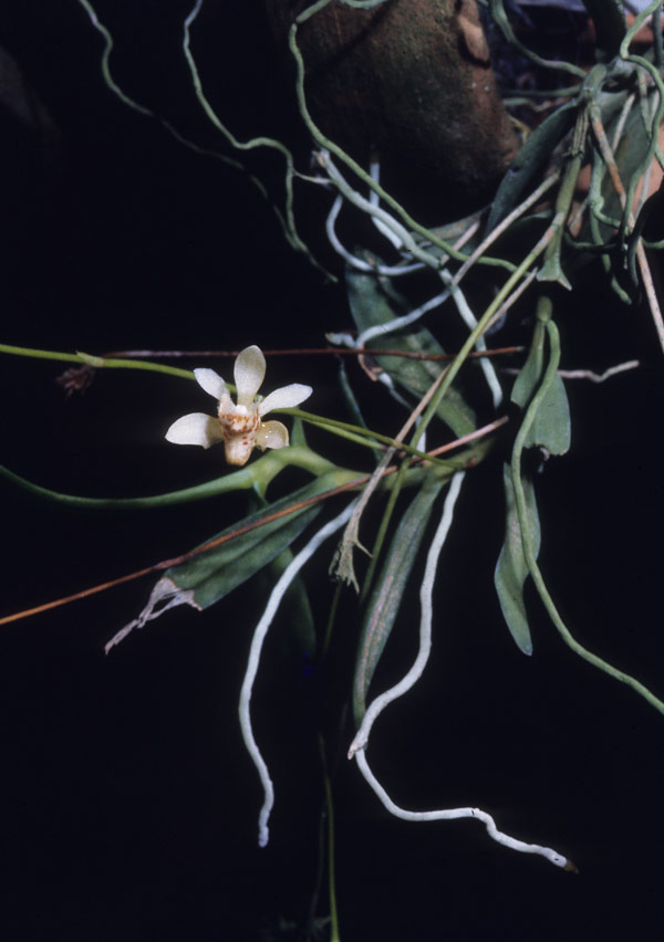 Found in west Java at elevations of 1400 to 1700 meters as a small to medium sized, cool growing twig epiphyte with thin, branched elongate stems carrying fleshy, lanceolate, slightly and unequally bilobed apically leaves that blooms in the late spring on a spreading to pendant, to 8" [20 cm] long ovarall, rachis to 2" [5 cm] long, successively single, many flowered inflorescence.