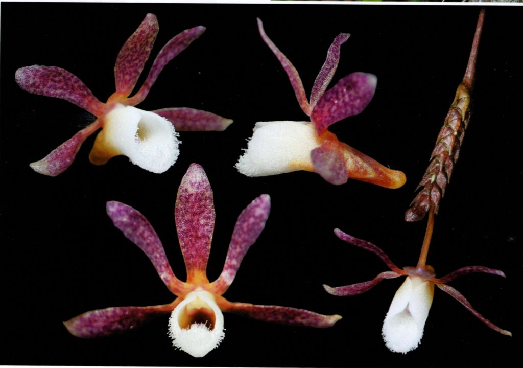 Found in Sabah Borneo lowland forests on riverside trees at lowelevations as a mini-miniature sized, hot growing epiphyte with spreading stems enveloped by slightly compressed, green, persistent, longer than the internodes sheaths and carrying distichous, oblong to strap-shaped, thick, green purple suffused in youth, unequally bilobed, obtuse leaves that blooms in the fall on many, suberect, arising from the lower and middle nodes of the stem, green to brown to maroon, peduncle 2 to 72" [5 to 18 cm] long, provided with 2 tubular, basal bracts and 2 more along the length, stiff & wiry, slightly expanded before the rachis, rachis swollen, to 1.12" [2.8 cm] or more, successively 1, several flowered inflorescence with crowded, triangular, keeled, the keel extended to form a free standing acerose pointed apex, hel parellel and close to the rachis, wheat-like, shorter than the ovary floral bracts and carrying ephemeral, widespread flowers.