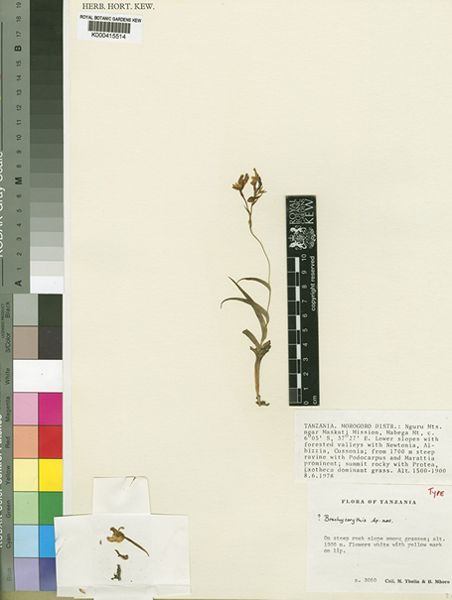Found in Tanzania in the Nguru Mountains at elevations of 1900 to 2100 meters in upland grasslands on steep rocky slopes as a miniature sized, cool growing terrestrial with a bsal tuber giving rise to an erect, slender stem and carrying to 7, suberect to arcuate, narrowly lanceolate, acuminate, basally clasping leaves that blooms in the winter on an erect, 3.6" [to 9 cm] long, few flwoered, slender, wiry inflorescence.
