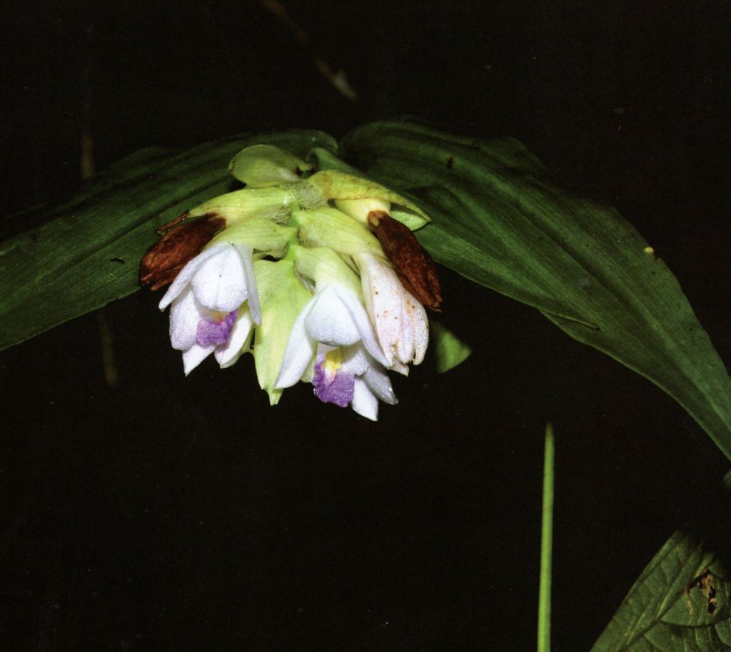 Found in northern Myanmar and Yunnan province of China on limestone mountains in sparse mossy forests at elevations around 1200 meters as a sized, warm growing terrestrial or lithophyte with clustered stems carrying many elliptical leaves that blooms in the late spring on a terminal, subsessile, many flowered inflorescence