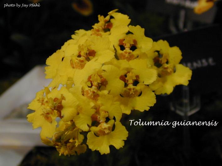 Synonyms Oncidium desertorum Nash ex Withner 1967; Oncidium guianense f. aureorubrum (Moir) Withner 1980; Oncidium desertorum var. alborubrum ( Moir & Hawkes ) Garay 1970; Oncidium desertorum var. album ( Moir & Hawkes ) Garay 1970; Oncidium desertorum var. aureorubrum (Moir) 1972; Oncidium guianensis (Braem) Garay 1973; Oncidium guianense f. album (Moir & A.D.Hawkes) Withner 1980; Oncidium guianense f. aureorubrum (Moir) Withner 1980;Oncidium guianense subsp. alborubrum (Moir & A.D.Hawkes) Withner 1980 ; Oncidium guianense var. alborubrum ( Moir & Hawkes ) Withner 1979; Oncidium guianense ( Aubl. ) Garay var. album ( Moir & Hawkes ) K.S.Wilson 1979; Oncidium guianense var. aureorubrum (Moir) K.S.Wilson 1979; Oncidium intermedium Bert ex Spreng. 1826; Oncidium intermedium Knwl. & Westc. 1838; Oncidium intermedium Knowles & Westc. var. alborubrum Moir & Hawkes 1967; Oncidium intermedium Knowles & Westc. var. album Moir & Hawkes 1967; Oncidium lemonianum Lindl. 1835; Ophyrs aloidea Poiret 1798; *Ophrys guianensis Aubl.1775; Tolumnia lemoniana ssp lemoniana Braem 1990