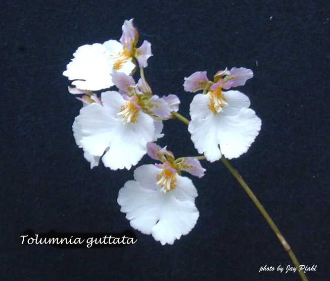 Synonyms Cymbidium guttatum [L.]Willd. 1805; Cymbidium tetrapetalum (Jacq.) Sw. 1799; Epidendrum acinaciforme Pav. ex Lindl. 1833; *Epidendrum guttatum L. 1753; Epidendrum tetrapetalum Jacq. 1760; Oncidium apiculatum Moir 1968; Oncidium berenyce Rchb.f. 1862; Oncidium boydii hort. ex Lindl. 1855; Oncidium cuneilabium Moir 1968; Oncidium luridum var. guttatum ( L. ) Lindl. 1839; Oncidium pauciflorum Lindl. 1821; Oncidium pulchellum f. apiculatum (Moir) Withner 1980; Oncidium pulchellum f. berenyce (Rchb.f.) Withner 1980; Oncidium pulchellum f. cuneilabium (Moir) Withner 1980; Oncidium quadripetalum Sw. 1800; Oncidium tenellum F.Gérard 1847; Oncidium tetrapetalum (Jacq.) Willd. 1806; Oncidium tricolor Hook. 1845; Tolumnia apiculata ( Moir ) Braem 1986; Tolumnia berenyce ( Rchb.f. ) Braem 1986; Tolumnia cuneilabia ( Moir ) Braem 1986; Tolumnia tetrapetala (Jacq.) Braem 1986; Xaritonia elegans Raf. 1838