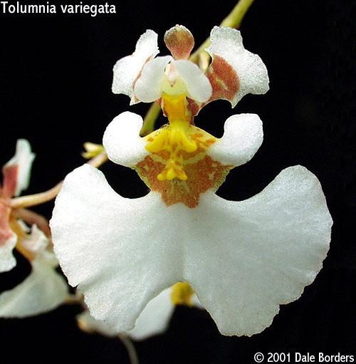 Synonyms Cymbidium variegatum (Sw.) Sw. 1799; Epidendrum carinatum Vahl 1793; Epidendrum haseltonianum A.D.Hawkes 1957; *Epidendrum variegatum Sw. 1788; Oncidium × furcyense Moir 1969; Oncidium variegatum [Sw.]Willd. 1800; Oncidium variegatum f. furcyense (Moir) Withner 1980; Oncidium variegatum f. roseum (Moir & A.D.Hawkes) Withner 1980; Oncidium variegatum f. varvelum (Moir) Withner 1980; Oncidium variegatum var. purpureum Moir & A.D.Hawkes 1968; Oncidium variegatum var. roseum Moir & A.D.Hawkes 1968; Oncidium × varvelum Moir 1972; Tolumnia borinquensis Salueda & Ragan 1966