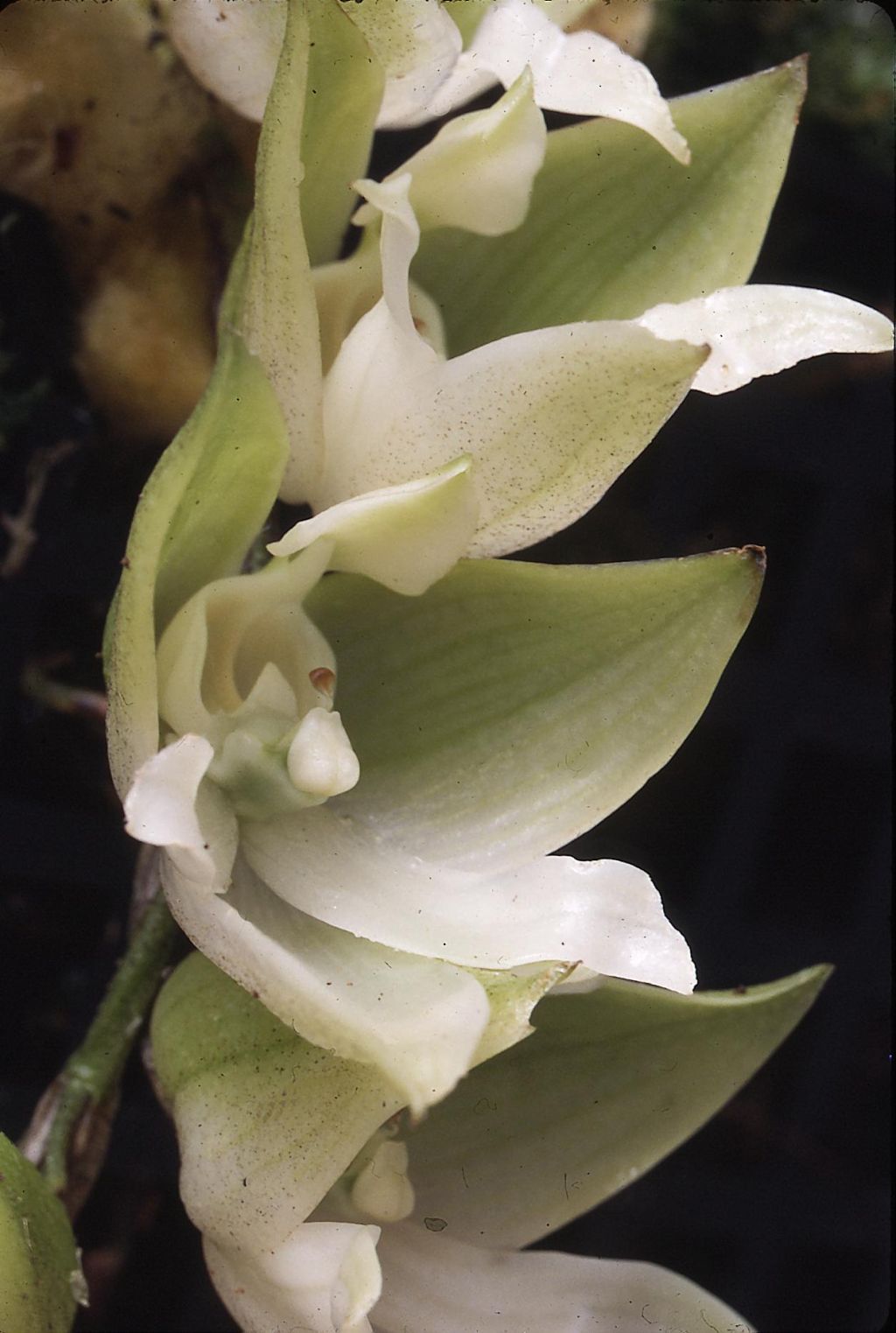 Found in southern Colombia and northern Ecuador at elevations of 1150 to 1500 meters as a medium sized, warm growing epiphyte with cylindrical pseudobulbs carrying plicate leaves that blooms in the fall on a pendent, to 10" [to 25 cm] long, 3 to 5 flowered inflorescnece