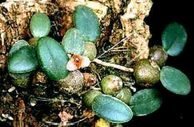 This miniature species is found only in Thailand and has .2 to .4" [4 to 10 mm] between each, round, carunculate pseudobulb that hold a single, apical, thick, oval, slightly retuse leaf and blooms in the summer on to several very short to .2" [5 mm] long, basal, inflorescence with 1 to 2, hyaline basal sheaths and a hyaline, cup-shaped, enveloping floral bracts that carries a single flower and needs to be mounted, given hot to cool growing conditions and light shade and high humidity.