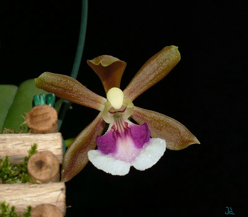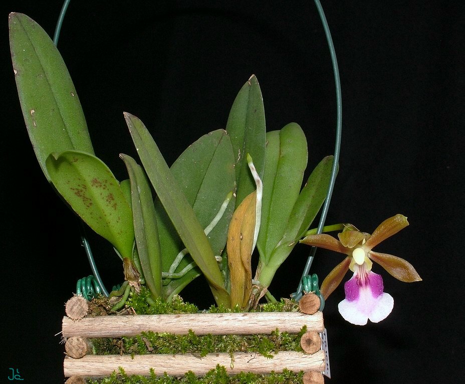 A miniature sized, hot to warm growing epiphyte from Peru, Ecuador and Brazil in wet tropical forests with small, clustered, ovoid, pseudobulbs carrying a single apical, coriaceous, small, elliptic, acute, sessile, fleshy leaf that blooms in the summer and fall on a lateral, 2 1/2 to 3" [6 to 7.5 cm] long, single flowered inflorescence with up to 5 successive opening, floral scented flowers over several months.