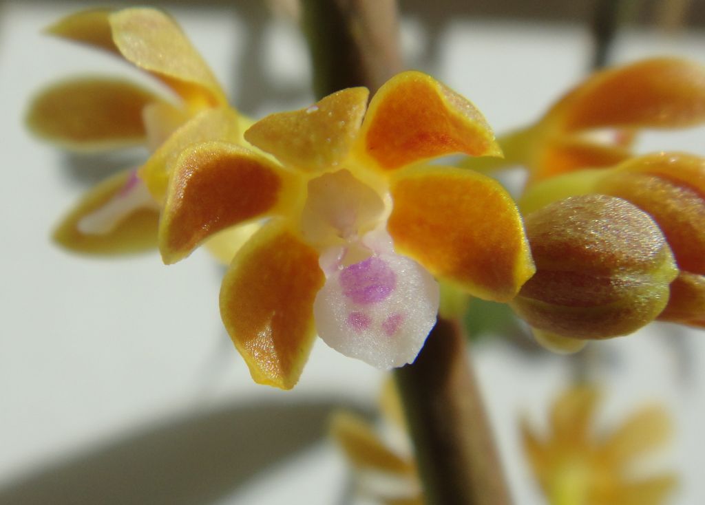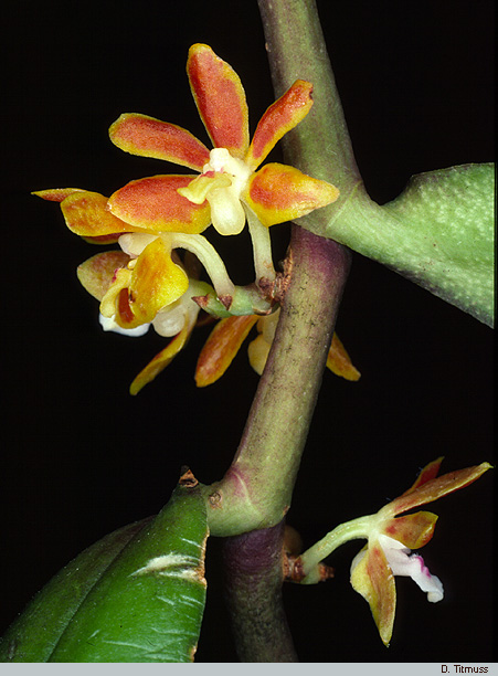 Found in the Philippines as a medium to large sized, pendulous, warm to cool growing, monopodial epiphyte in dense shade at elevations around 1000 to 1200 meters with pendulous, elongate, stems enveloped by cylindric leaf sheaths and carrying alternate, leathery, linear-lanceolate, contracted and slightly conduplicate basally, unequally notched apically leaves that blooms on a short to .4" [1 cm] long , several [10] flowered inflorescence.