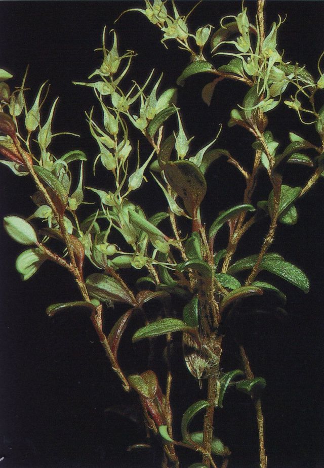 "Large specimens of this species resemble dense, small-leaved shrubs. It grows terrestrially in cold forests at elevations around 3000 meters from sothern Colombia to northern Peru. Although supporting ramicauls are long and stout, the majority of the proliferic, branching ramicauls are short and crowded. The inflorescence consists of an inconspicuous, few flwered raceme of small whtish flowers. The sepals ae long-acuminate and the lip is three lobes witha pair of calli at the front margin of the lateral lobes as seen in many allied species." Luer 1997