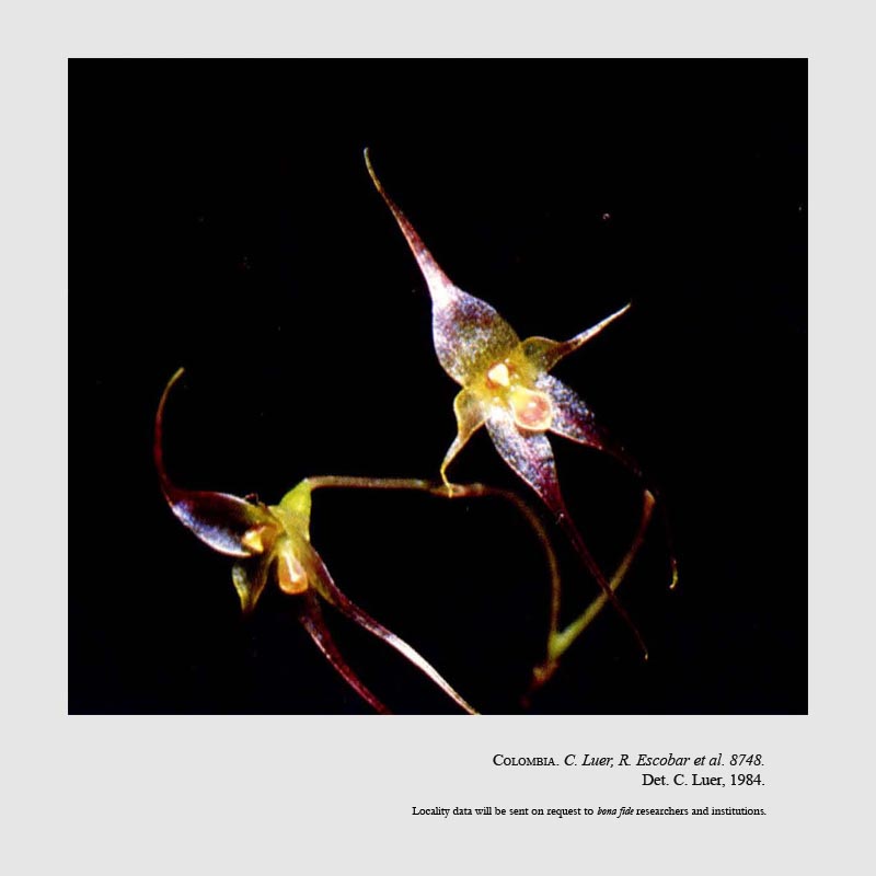 "Distinguished by the sepals and petals are long-caudate. The lip isobovate and shallowly cleft near the apex between a pair of low rounded calli. The basr is convex and deeply concave beneath." Luer 1997