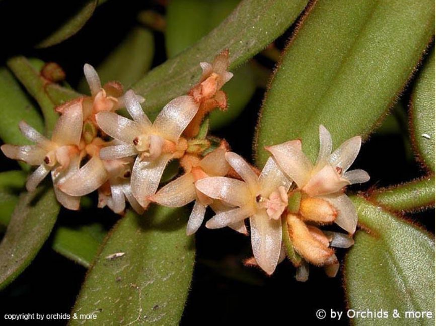 Found in Malesia as a small sized epiphyte with a reddish pubescent stem carrying distichous, reddish pubescent margined, lanceolate leaves that blooms in the late summer and early fall on an axillary, short, 6 to 10 flowered inflorescence