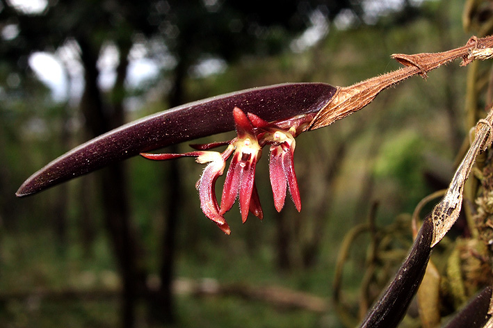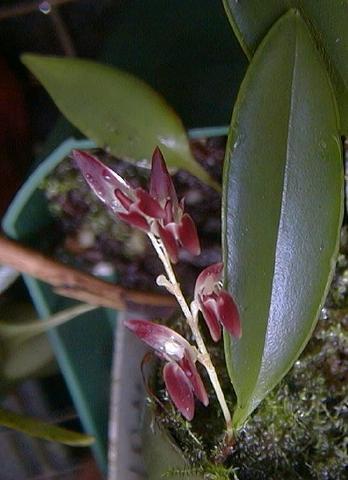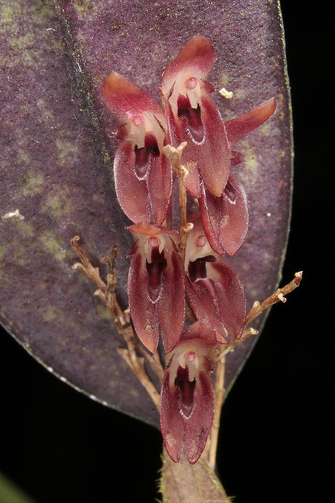 Found in Mexico, Belize, Guatemala, El Salvador, Nicaragua, Costa Rica, Panama, western Colombia and Ecuador in tall evergreen rain forests at elevations of 200 to 2500 meters as a miniature sized, hot to cold growing epiphyte with ramicauls enveloped by several loose, acuminate, ciliate, lepanthiform sheaths and carrying a single, apical, coriaceous, narrowly elliptic, acute, gradually narrows below into the conduplicate petiolate base leaf that blooms in the late spring through early winter on an erect, arising from the leaf base, peduncle filiiform, .2 to .8" [.5 to 2 cm] long, short, .6 to 1.6" [1.5 to 4 cm] long overall, lax to subdense, simultaneously several flowerd inflorescence with shorter than the ovary floral bracts.
