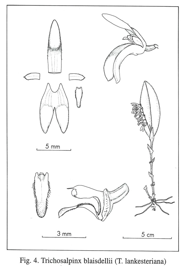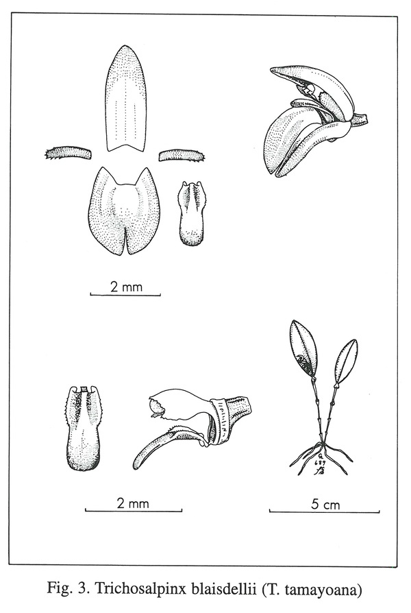 References W3 Tropicos, Kew Monocot list , IPNI ; Lankester's Epidendra Website CR ; Proc. Amer. Acad. Arts 23: 284. 1888 as Pleurothallis blaisdellii; The Orchids of Panama L.O. Williams & P Allen 1946 as Pleurotyhallis blaisdellii drawing fide; Orchids of Guatemala and Belize Ames & Correll 1952 as Pleurothallis blaisdelii drawing good; Encyclopedia of Cultivated Orchids Hawkes 1965 Pleurothallis blaisdellii; Las Orquedias De El Salvador Vol 2 Hamer 1974 as Pleurothallis blaisdellii drawing fide/photo hmm; Venezuelan Orchids Illustrated Vol 6 Dunsterville & Garay 1976 as Pleurothallis blaisdellii drawing = T patula; Flora de Venezuela Foldats Volumen XV Part 2 1970 as Pleurothallis blaisdellii drawing fide; Orchids of Venezuela, An Illustrated Field Guide Vol 3 Dunsterville & Garay 1979 as Pleurothallis baisdellii drawing = T patula; Las Orquedias de El Salvador Vol 3 Hamer 1981 as Pleurohtallis blaisdellii drawing ok; Icones Planetarum Tropicarum plate 1249 Dodson 1984 as Pleurothallis blaisdellii drawing fide; ORQUIDEA (Méx. ) 10 (2) 1987 photo/drawing fide; ORQUIDEA (Méx. ) 10 (2) Soto Arenas 1987 as T tamoyoana photo/drawing fide; Icones Pleurothallidinarum Vol XV Systematics of Trichosalpinx Luer 1997 drawings fide; Native Colombian Orchids Vol 6 COS 1998 photo fide; Guatemala Y Sus Orquideas Behar & Tinschert 1998 photo fide; Orchids of Venezuela [An illustrated field guide] Vol. 3 Ramiro and Carnevali 2000 drawing fide; Manual de Plantas de Costa Rica Vol 3 Hammel, Grayum, Herrera and Zamora 2003; Native Ecuadorian Orchids Vol 5 Dodson 2004 drawing fide; Orquideas de la Serrania del Baudo Misas Urreta 2006 drawing/photo fide; Diversity of Pleurothallidinae in Guatemala: An Endangered Orchid Subtribe with High Economic and Horticultural Potentials Edgar Mo Mo, Cetzal, Basu and Vega 2017 photo fide; Orchid Genera and Species in Guatemala Archila, Szlachchetko, Chiron, Lipinska, Mystkowska and Bertolini 2018; Orchid Genera and Species in Guatemala Archila, Szlachchetko, Chiron, Lipinska, Mystkowska and Bertolini 2018 as T tamayoana