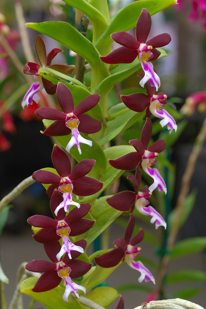 This small to large sized, hot growing, epiphytic species is from the Philippines at elevations of sealevel to 300 meters with elongated, branching, white roots produced all along the erect, leafy towards the apex stem carrying distichous, coriaceous, oblong to oblong-ovate, retuse, mucronate, carinate leaves stem and blooms on an axillary, short, racemose inflorescence with 1 or 2 fragrant, fleshy flowers occuring in the spring and summer.