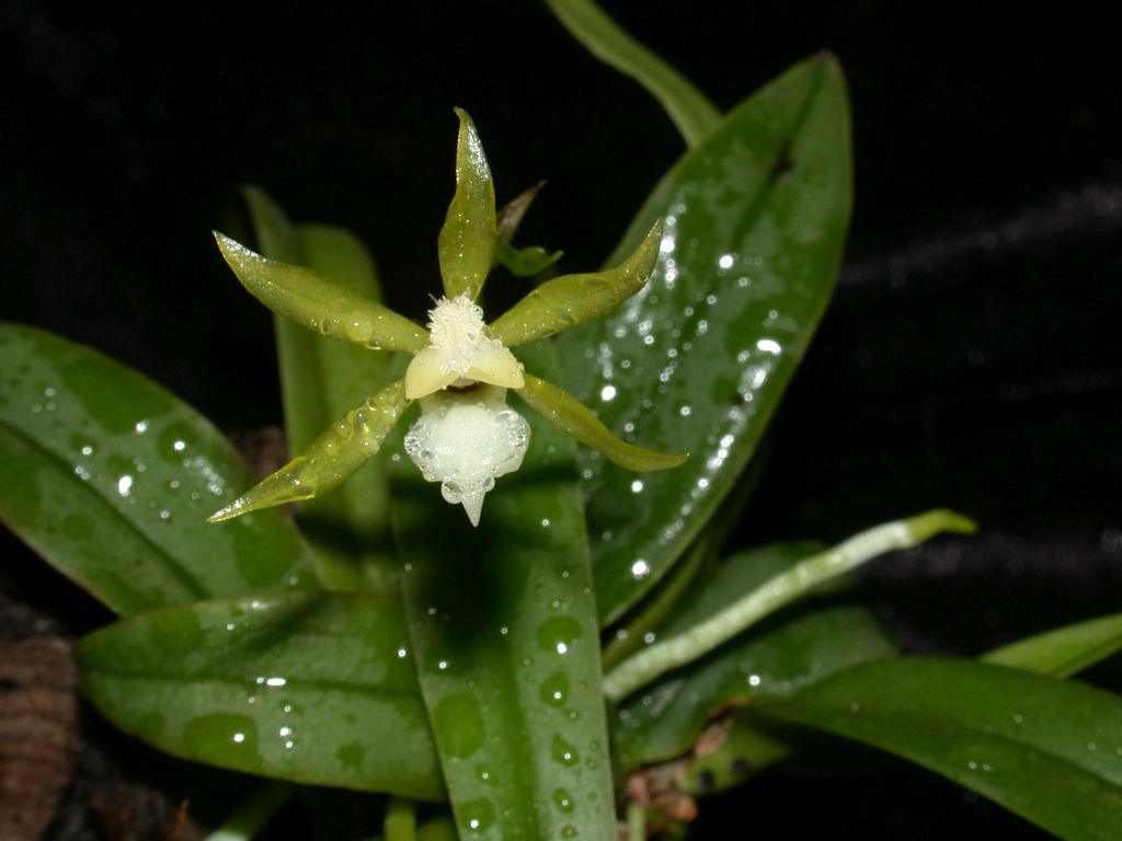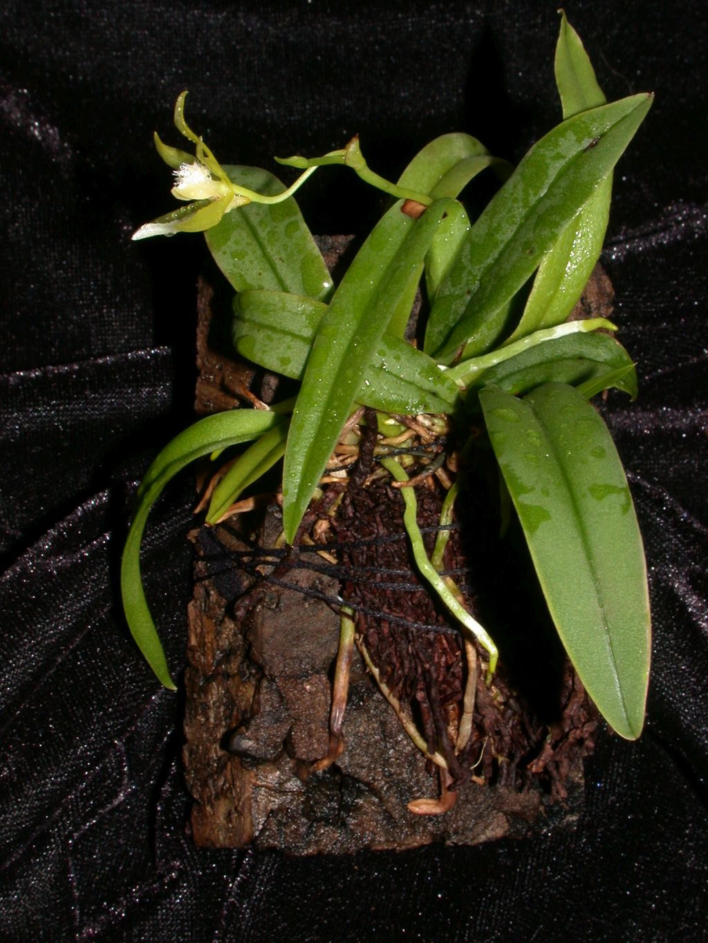 Found in Costa Rica, Panama, Colombia and Venezuela in lowland, tropical and premontane rainforests at elevations around 225 to 1000 meters as a miniature sized, hot to warm growing epiphyte with nearly obsolete pseudobulbs each carrying a single, apical, fleshy, oblong-lanceolate to elliptic-lanceolate, acute, gradually narrows below into the base leaves and blooms at any time of the year on a lateral, pendant, racemose, 3/4" to 1 3/4" [2 to 4 cm] long, successively single, few [3 to 5] flowered inflorescence with concave, triangular, acute bracts.