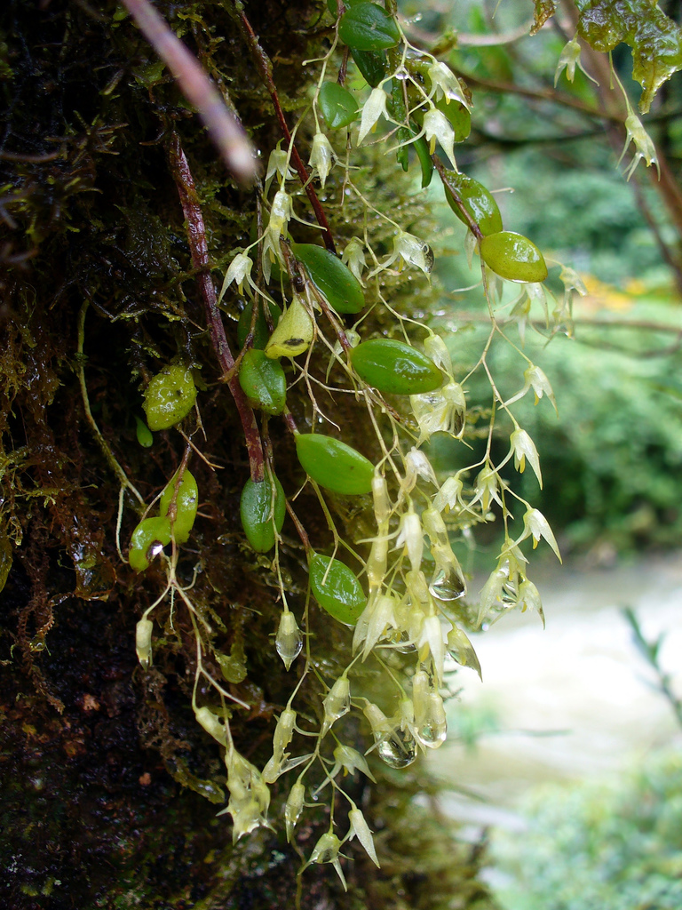 Found in Guatemala, El Salvador, Costa Rica, Panama, Venezuela, Colombia, Ecuador, Peru and Bolivia in cloud forests at elevations of 1000 to 2200 meters as a miniature sized, cool to cold growing epiphyte with ascending, slender ramicauls that produce another ramicaul from the apex and enveloped basally by 2 to 6, microscopically ciliate, lepanthiform sheaths and carrying a single, apical, erect, thickly coriaceous, elliptical, subacute, contracted below into a petiolte base leaf that blooms in the late spring and early summer on a loose, .8 to 1.2" [2 to 3 cm] long, flexuous, subsecund, simultaneously several flowering inflorescence arising from near the apex of the ramicaul.