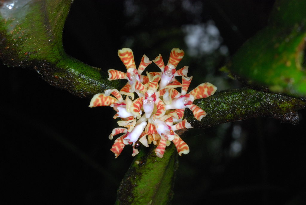 Found in Sabah and Sarawak, Borneo in mixed, ridge-top, hill or lower montane forests on mossy trees at elevations of 600 to 1600 meters as a small to medium sized, warm to cool growing epiphyte with an erect to pendant, occasionally branching stem carrying 11 to 16, thick, leathery, ligulate, retuse to unequally bilobed apically leaves attached below to rugulose, black spotted and streaked sheaths that blooms in the spring on axillary, sessile, thick, fleshy, .22 to .25" [6 to 7 mm] long, to 6 flowered inflorescence with reduced and scale like floral bracts.
