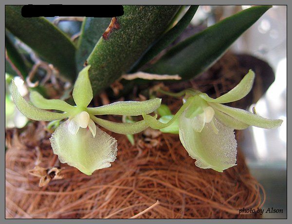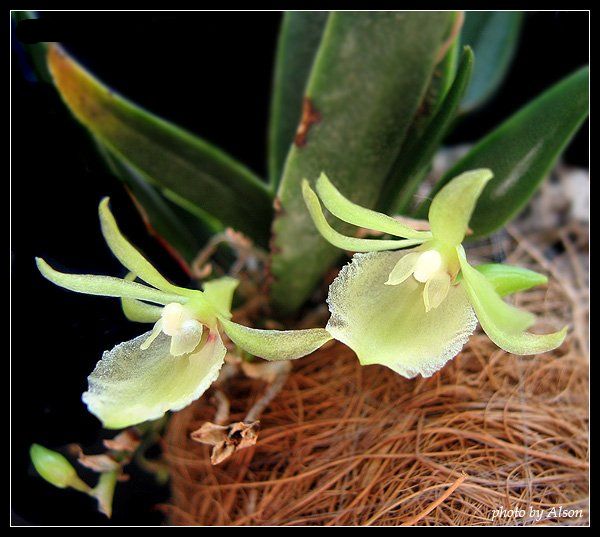 Found from Costa Rica on mossy trunks and small branches in deep shade in evergreen forests at elevations around 600 to 750 meters as a mini-miniature sized, hot to warm growing epiphyte with minute, rounded pseudobulbs carrying a single, apical, dark green, fleshy, sessile, linear elliptic to elliptic, obtuse to acute leaf that blooms in the fall on a pendant, racemose, 2.8" [7 cm] long, fractiflex, 1 to 7 successively single flowered inflorescence
