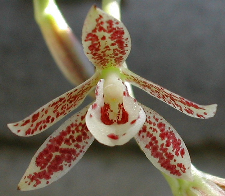 Found in Zamora-Chinchipe province of Ecuador at elevations around 1800 meters as a miniature sized, cool growing epiphyte with clustered, oblong, laterally flattened pseudobulbs carrying a single, apical, oblong-elliptic, acuminate, abruptly narrowing below into the shortly conduplicate base leaf that blooms in the early summer on a basal, to 3.2" [8 cm] long, rachis provided with 3 to 5 obtuse, close, imbricate bracts, pendulous, 2 to 3 flowered inflorescence with obtuse, shorter than the ovary floral bracts and carries fragrant flowers.