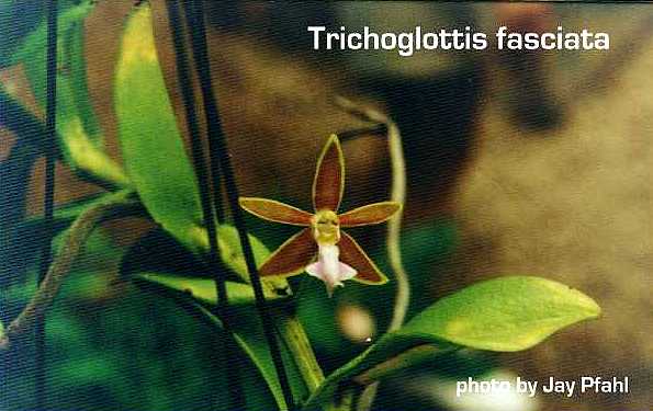 References W3 Tropicos, Kew Monocot list , IPNI ; Xenia Orchidaceae Vol 3 Reichenbach 1894 as Stauropsis fasciata drawing fide; Die Orchideen Schlechter 1915; Atlas des Orchidees Cultivees Constantin 1920 as Stauropsis fasciata drawing fide; The Orchids of Thailand Seidenfaden & Smitinand 1963 drawing/photo fide; Encyclopedia of Cultivated Orchids Hawkes 1965 as Trichoglottis fasciata photo fide; Orchid Digest Vol 37 No 6 1973 photo fide; Beautiful Thai Orchid Species Kamemoto & Sagarik 1975 photo fide; The Complete Writings on Philippine Orchids Vol 1 Quisumbing 1981 as Stauropsis fasciata drawing/photo fide; Orchidiana Philipiniana Vol 1 Valmayor 1984 as Trichoglottis fasciata; Rudolf Schlechter Die Orchideen Band 1B lieferung 21 1165 - 1328 Brieger 1988 drawing/photo fide; Opera Botanica #95 Seidenfaden 1988 drawing/photo fide; The Orchids of Penninsular Malaysia and Singapore Wood & Seidenfaden 1992 as Staurochilus fasciatus drawing/photo fide; The Manual Of Cultivated Orchid Species Bechtel, Cribb & Launert 1992 photo fide; Thai Orchid Species Rakpaibulsombat 1992 as Trichoglottis fasciata photo fide; AOS Bulletin Vol 63 No 10 1994 photo fide; A Checklist of the Orchids of Borneo Wood & Cribb 1994 as Staurochilus fasciatus; Identification of the Orchids [Orchidaceae Juss.] Vietnam Averyanov 1994 as Staurochilus fasciatus; The Orchids of the Philippines Cootes 2001 as Staurochilus fasciatus photo fide; A field Guide to the Wild Orchids of Thailand Vaddhanaphuti 2001 photo fide; Orchids of Sumatra Comber 2001 as Staurochilus fasciatus photo fide; Flora Malesiana Orchids of the Philippines Vol I Agoo, Shuiteman and de Vogel 2003; A field Guide to the Wild Orchids of Thailand Vaddhanaphuti 2005 photo fide; Malesian Orchid Journal Vol 1 2008 photo; A to Z of South East Asian Orchid Species Vol 2 O'Byrne 2011 photo fide; Genera Orchidacearum Vol 6 Epidendroides Pt 3 Pridgeon, Cribb, Chase and Rasmussen 2014 as T fasciatus; AOS Bulletin Vol 85 #1 2016 photo fide;