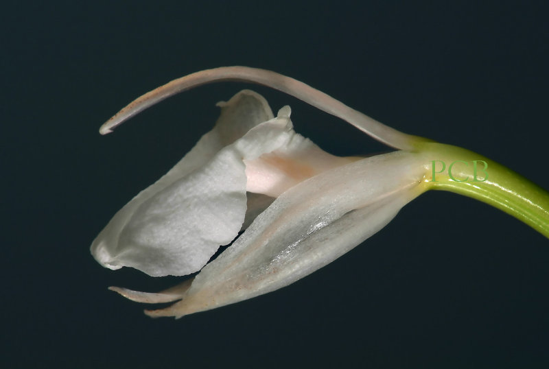 Found in Peru in shady forests at elevations around 1800 meters as a small sized, warm to cool growing epiphyte with linear-cylindric, compressed pseudobulbs enveloped basally by6 a few, firm, evanescent sheaths and carrying a single, apical, linear-oblong to elliptic-oblong, subcoriaceous, acute, shortly narrowing below into the sessile to shortly petiolate base leaf that blooms in the fall on a basal, suberect, very loosely 2 to 3 flowered, to 7" [17.5 cm] long inflorescence with 3 close, tubular, well spaced bracts and closely clasping, much shorter than the ovary floral bracts