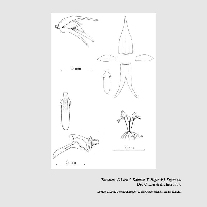 Found in southern Ecuador in scrubby cloud forests at elevations around 3350 meters as a mini-miniature sized, cold growing epiphyte with erect, slender ramicauls enveloped by 3, microscopically ciliate, lepanthiform sheaths and carrying a single, apical, erect, thickly coriaceous, elliptical, subacute to obtuse, cuneate below into the petiolate base leaf that blooms in the fall on a filiform, fascile of 3 to 5, loose, .2 to .24" [5 to 6 mm] long, successively 2 to 3 flowered inflorescence arising from a node below the apex of the ramicaul.