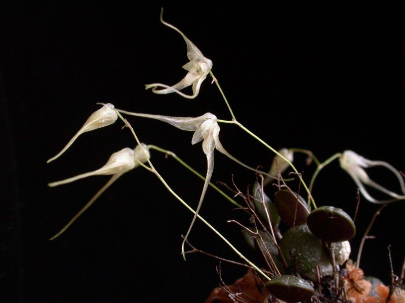Found in southeastern Ecuador in windswept elfin forests at elevations of 2700 to 3500 meters as a miniature sized, cold growing epiphyte with erect, slender ramicauls that can produce new ramicauls from the apex of the old and enveloped basally by 3 to 4 microscopically ciliate, lepanthiform sheaths and carrying a single, erect, thickly coriaceous with convex surfaces, often purple striped, elliptical, subacute to obtuse leaf that is cuneate below into a petiole and blooms in the summer and fall on a loose, single flowered with 2 to 3 flowers in succession, 2/3" to 1" [1.5 to 2.5 cm] long, racemose inflorescence arising from near the apex of the ramicaul.