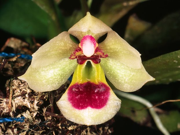 Found in Colombia, Ecuador and Peru as a miniature sized, cool to warm growing epiphyte at elevations of 900 to 1800 meters in wet, deeply shaded montane forests with a fan-shaped growth having oblong-lanceolate, coriaceous, acute, gradually narrows below into the conduplicate base leaves that blooms on a short, 2 2/5" [6 cm] long, single flowered inflorescence with a small, infundibuliform floral bracts carrying a single campanulate flower held below the leaves occuring in nature in the fall and winter in cultivation