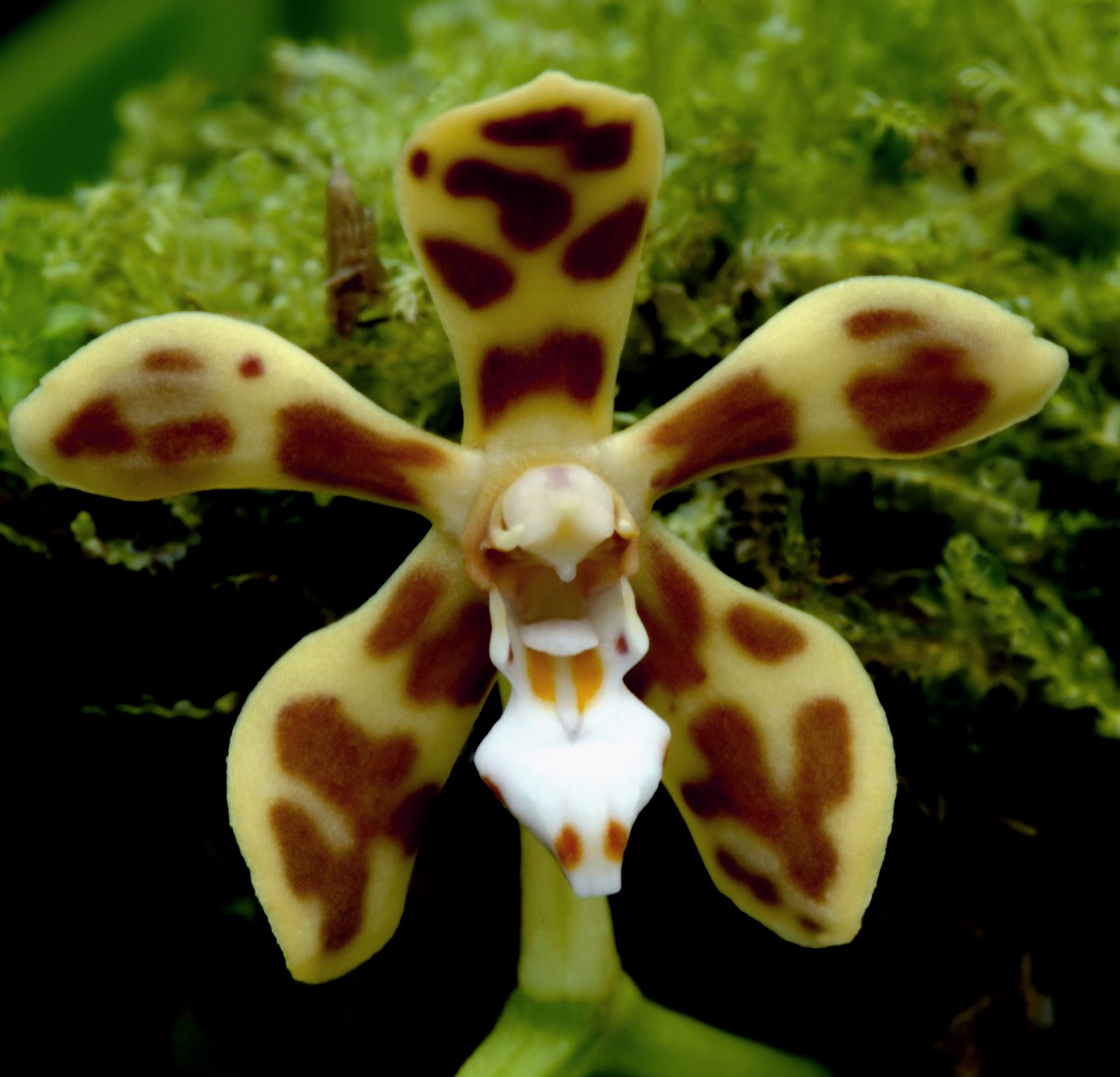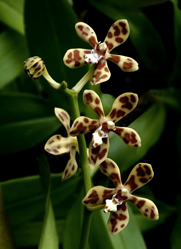 Found in Sulawesi on roadside trees at elevations around 500 meters as a large sized, hot to warm growing epiphtye with a stiffly erect, simple, slightly compressed stem leafy all along the length and carrying distichous, spreading, oblong, very stiff, coriaceous, dark green, paler beneath, often stained grey, tapering and v shaped towards the base, tapering towards the apex, unequally, obtusely bilobed leaves that blooms in the winter and late spring through fall on a lateral, erect, simple to one short branched, rather compressed, 1.8 to 10" [4.5 to 25 cm] long, 2 to 18 flowered inflorescence with 3 imbricate, pale green bracts and carrying slightly fragrant, fleshy, long-lasting flowers.