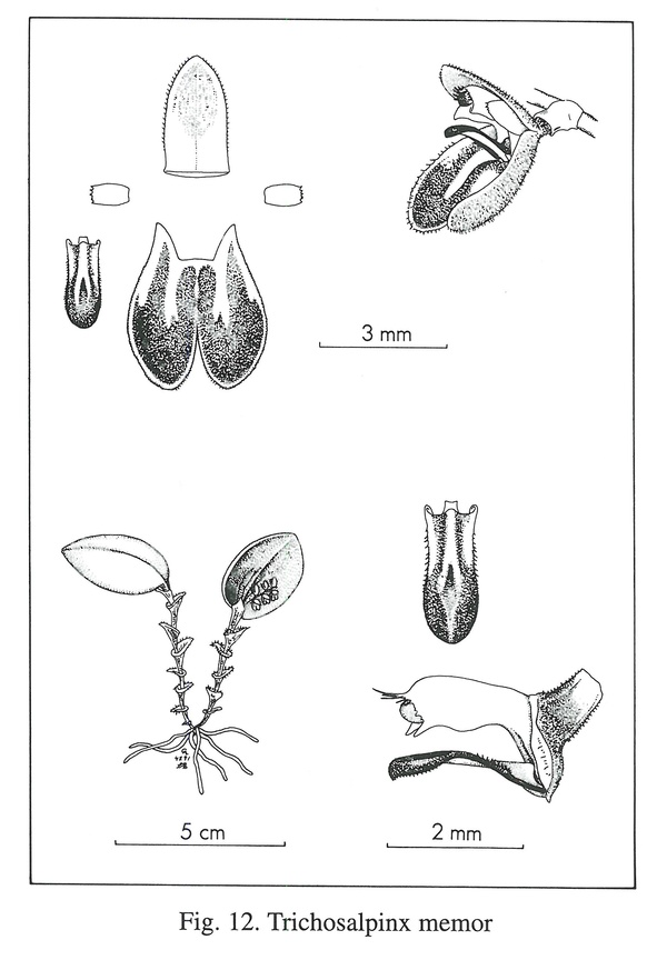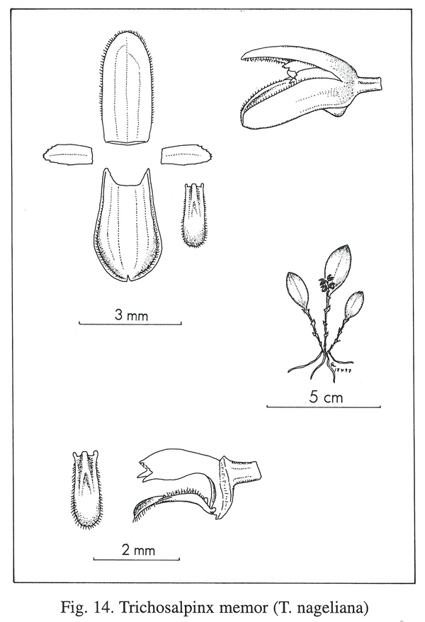 References W3 Tropicos, Kew Monocot list , IPNI ; Bonplandia Rchb.f 1856 as Pleurothallis memor; Repert. Sp. Nov. Regni. Veg. Beih. 19: 183. Costa Rica Schlechter 1923 as Pleurothallis brevis; The Orchids of Panama L.O. Williams & P Allen 1946 as Pleurothallis gnomonifera; Flora of the Lesser Antilles Garay & Sweet 1974 as Pleurothallis memor drawing fide; Venezuelan Orchids Illustrated Vol 6 Dunsterville & Garay 1976 as Pleurothallis memor drawing fide; Orchids of Venezuela, An Illustrated Field Guide Vol 3 Dunsterville & Garay 1979 as Pleurothallis memor drawing fide; Icones Planetarum Tropicarum plate 1254 Dodson 1985 as Pleurothallis memor drawing close lip is different; The Orchids of Surinam Werkhoven 1986 as Pleurothallis memor photo ok; ORQUIDEA (Méx. ) 10 (2) Soto Arenas 1987 as T greenwoodiana photo/drawing fide; ORQUIDEA (Méx. ) 10 (2) Soto Arenas 1987 as T nagelianaphoto/drawing fide Icones Orchidacearum Peruviarum Plate 197 Bennett & Christenson 1993 drawing ok; Icones Pleurothallidinarum Vol XV Systematics of Trichosalpinx Luer 1997 drawing fide; Orchids of Venezuela [An illustrated field guide] Vol. 3 Ramiro and Carnevali 2000 drawing fide; Icones Orchidacearum 5 - 6 Orchids of Mexico Part 2 - 3 Plate 698 Hagsater & Soto 2002 drawing hmm; Icones Orchidacearum 5 - 6 Orchids of Mexico Part 2 - 3 Plate 699 Hagsater & Soto 2002 as T nageliana drawing ok; Flora of the Venezuelan Guayana Vol 7 Steyermark, Berry, Yatskievych and Holst 2003; Manual de Plantas de Costa Rica Vol 3 Hammel, Grayum, Herrera and Zamora 2003; Native Ecuadorian Orchids Vol 5 Dodson 2004 photo ok; Algunas Orquideas de Oaxaca Suarez 2004 as T nagelianaphoto fide; Orchid Species Of Peru Zelenko & Bermudez 2009 photo fide; Orquideologia Vol 28 #2 2011 drawing fide; Diversity of Pleurothallidinae in Guatemala: An Endangered Orchid Subtribe with High Economic and Horticultural Potentials Edgar Mo Mo, Cetzal, Basu and Vega 2017 as t greenwoodiana photo fide; Orchid Genera and Species in Guatemala Archila, Szlachchetko, Chiron, Lipinska, Mystkowska and Bertolini 2018; Orchid Genera and Species in Guatemala Archila, Szlachchetko, Chiron, Lipinska, Mystkowska and Bertolini 2018 as T nageliana