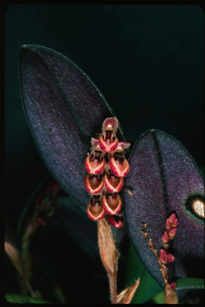 Found from Cuba, the Windward Islands, Mexico, Guatemala, El Salvador, Nicaragua, Costa Rica, Panama, Guyana, Surinam, Venezuela, Colombia, Ecuador and Bolivia in wet montane forests at elevations of 800 to 2150 meters as a miniature sized, warm to cool growing, caespitose epiphyte with a dark reddish brown, slender to stout, erect ramicaul enveloped by pubescent, lepanthiform sheaths with a single, apical, ellptic, minutely bidentate, gradually narrowing below into the petiolate base, opaque reddish green leaf that blooms in the fall through spring on a dense, short, distichous, simultaneous few to several flowered inflorescence that is minutely pubescent and arises through a sheath at the leaf base with the flowers held close to the leaf base.