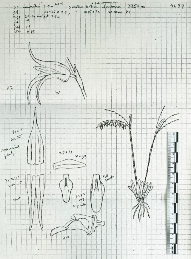 Found in Loja province of Ecuador in cloud forests at elevations around 3350 meters as a mini-miniature sized, cold growing epiphyte with 2 distinct vegetative forms, the sterile basal form has erect, stout ramicauls enveloped by 3 to 4 minutely ciliate lepanthiform sheaths and carrying an erect, thickly coriaceous, narrowly elliptical, acute, contracted below into the petiolate base leaf, the second vegetative form arising out and above the first has much longer, stout erect ramicauls enveloped by 6 to 7, coarsly pubescent, lepanthiform sheaths and carrying a single, apical, erect, thickly coriaceous, narrowly elliptical, acute, contracted below into the petiolate base leaf that blooms in the fall on 1 to 2, simultaneous, secund, [3 to 3.5 cm] long, several flowered inflorescence arising from near the apex of the ramicaul.
