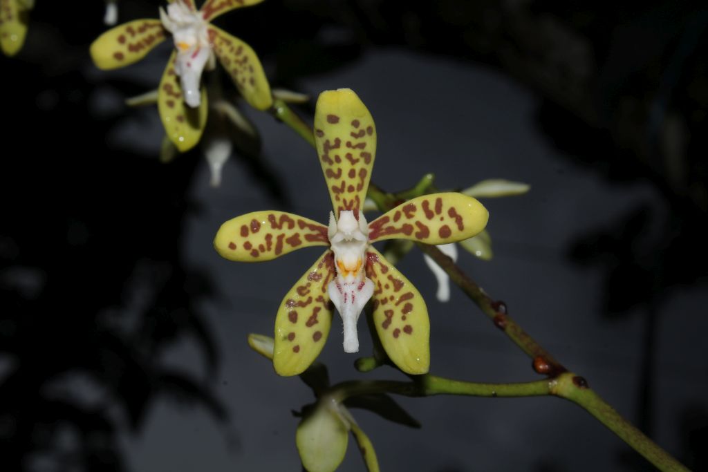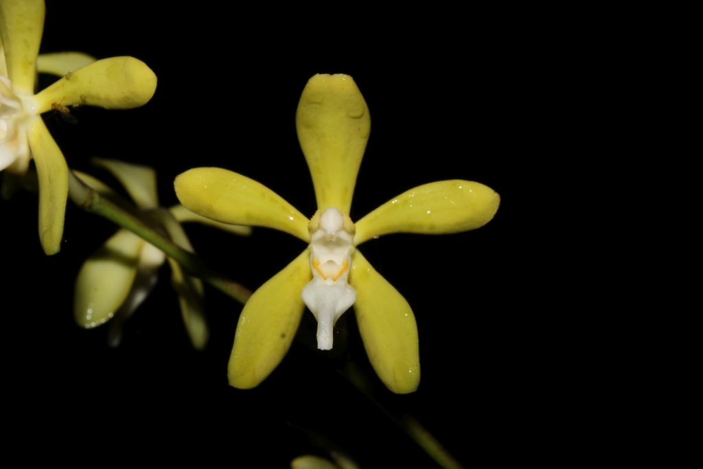 Found in Visayas of the Philippines in primary or secondary montane forest in half shady to brightly lit positions at elevations of 700 to 1000 meters as a medium sixed, warm growing, monopodial, upright epiphyte with an erect, cylindrical stem enveloped by leaf bearing sheaths and carrying elliptic to oblong, green, leathery, two ranked, glabrous, margin entire, apex unequally bilobed, sessile base leaves that blooms in the spring on an axillary, paniculate, lax, 1 to 3 branched, upright, dichotomously branching, longer than the leaves, up to 20" [50 cm] long, to 20 flowered inflorescence carrying fragrant blooms.