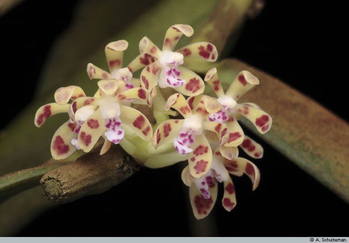 A tall, hot to warm growing monopodial epiphyte found in Papua and New Guinea at elevations of sealevel to 800 meters on tree trunks and high in large trees of rainforest and coastal forest with a pendent,woody towards the base, leafy in the apical part stem carrying fleshy, distichous, lanceolate, acute, basally clasping leaves that blooms in the fall on a lateral, opposite the leaf base, peduncle .06 to .08" [1.5 to 2 mm] long, 1" [2.5 cm] long, sub-sessile, 2 to 4 flowered inflorescence with the wide-open, fleshy, fragrant flowers held close to the the stem.