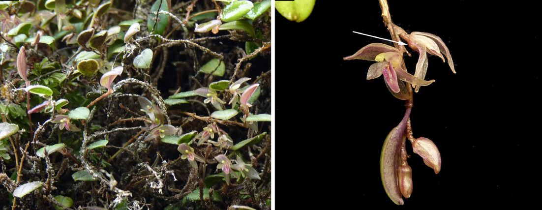 Found in La Paz department of Bolivia in cloud forests in dense moss pads at elevations around 3200 to 3400 meters as a mini-miniature sized, cold growing, mat forming epiphyte or terrestrial with ascending, prolific ramicauls enveloped by 3 to 7, microscopically ciliate lepanthiform sheaths and carrying a single, apical, erect, coriaecous, oblong-elliptic, obtus, papillose apex tothe mid vein shortly cuneate into the sulcate petiolate base leaf that blooms in the spring and summer on a racemose, peduncle provided with 1 to 2 bracts, .04 to .12" [1 to 6 mm] long, fl;exuous, .2 to .6" [.5 to 1.5 cm] long overall, few flowered, simultaneously 1 to 3 flowered inflorescence with infundibuliform, shorter to as long as the pedicel floral bracts.